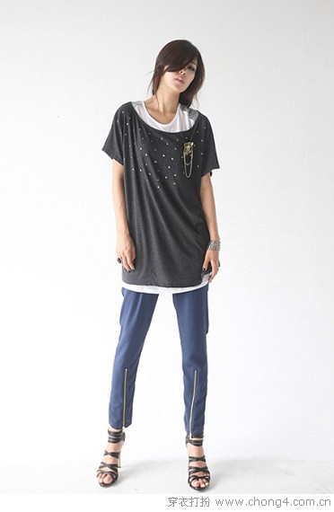 01 桃红色不对称领口设计T与灰色长T搭配出层次,非常有型